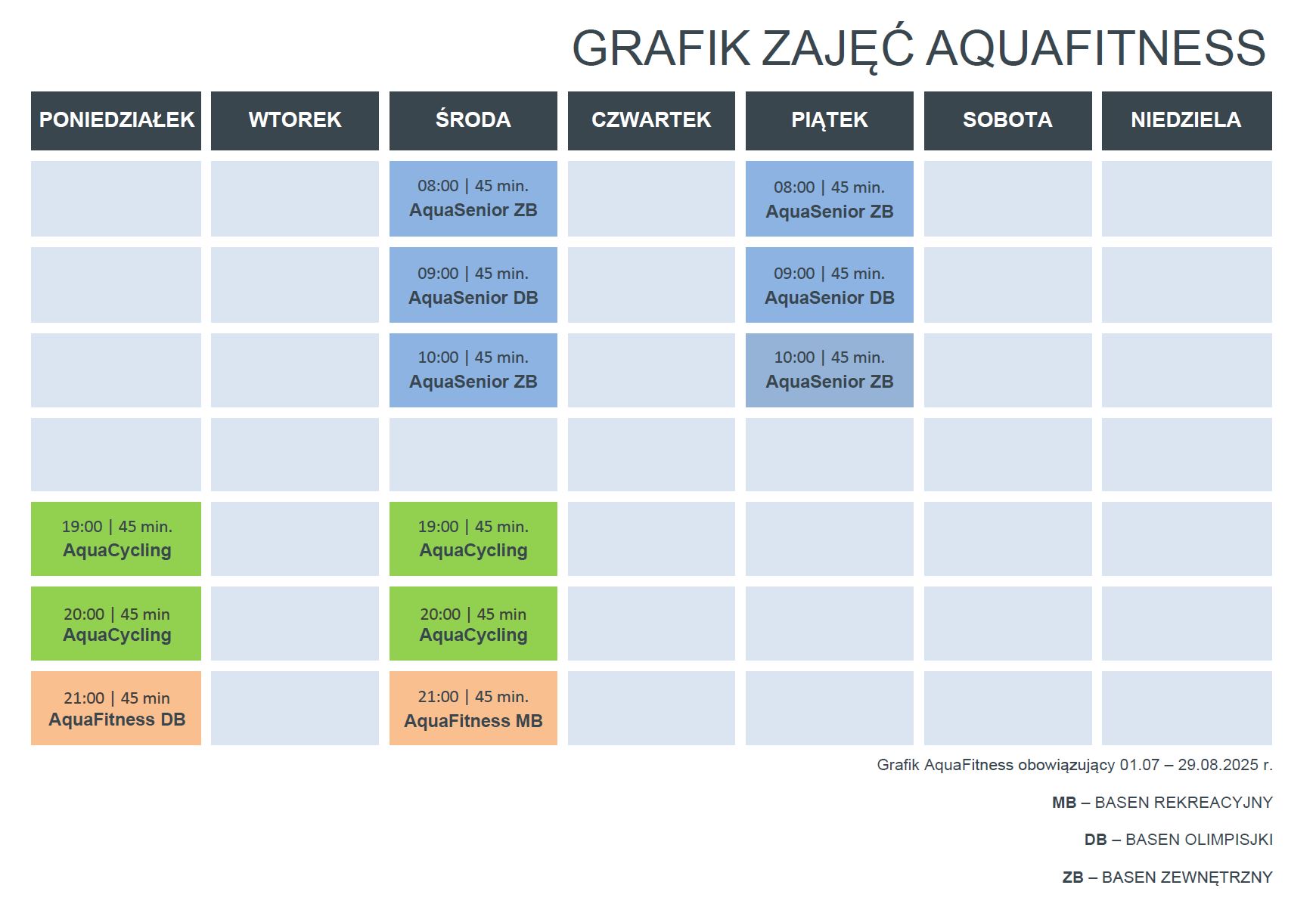 W dniach 1.07 - 29.08.2025 nie będą odbywać się zajęcia AquaSenior w poniedziałki.